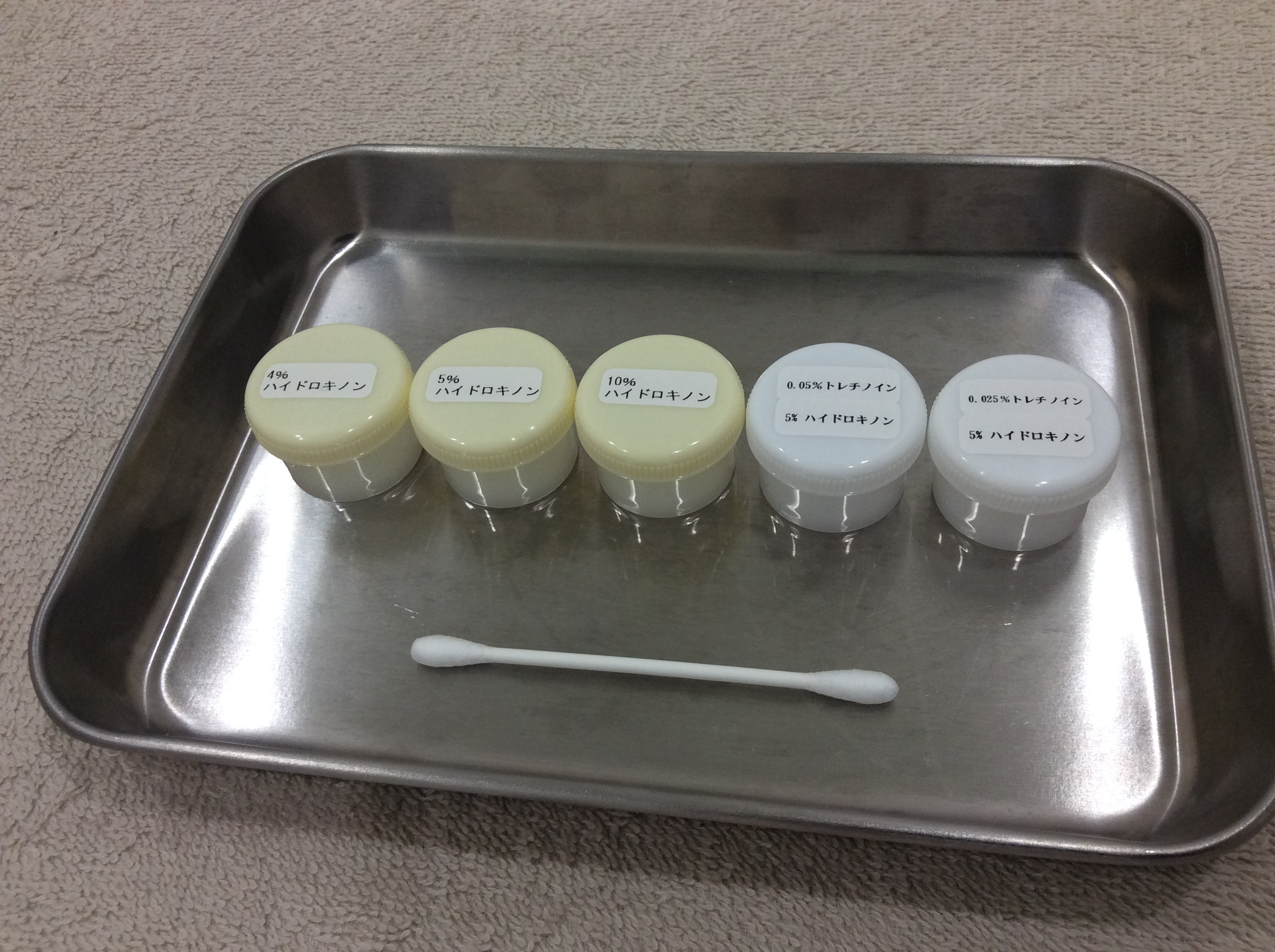 私が今使っているのは、4%ハイドロキノンですが、効果をみて濃度を変えたり、トレチノイン(レチノイン酸)というシミを剥がす効果のものと混ぜた薬に変えたりすることもあるそうです。