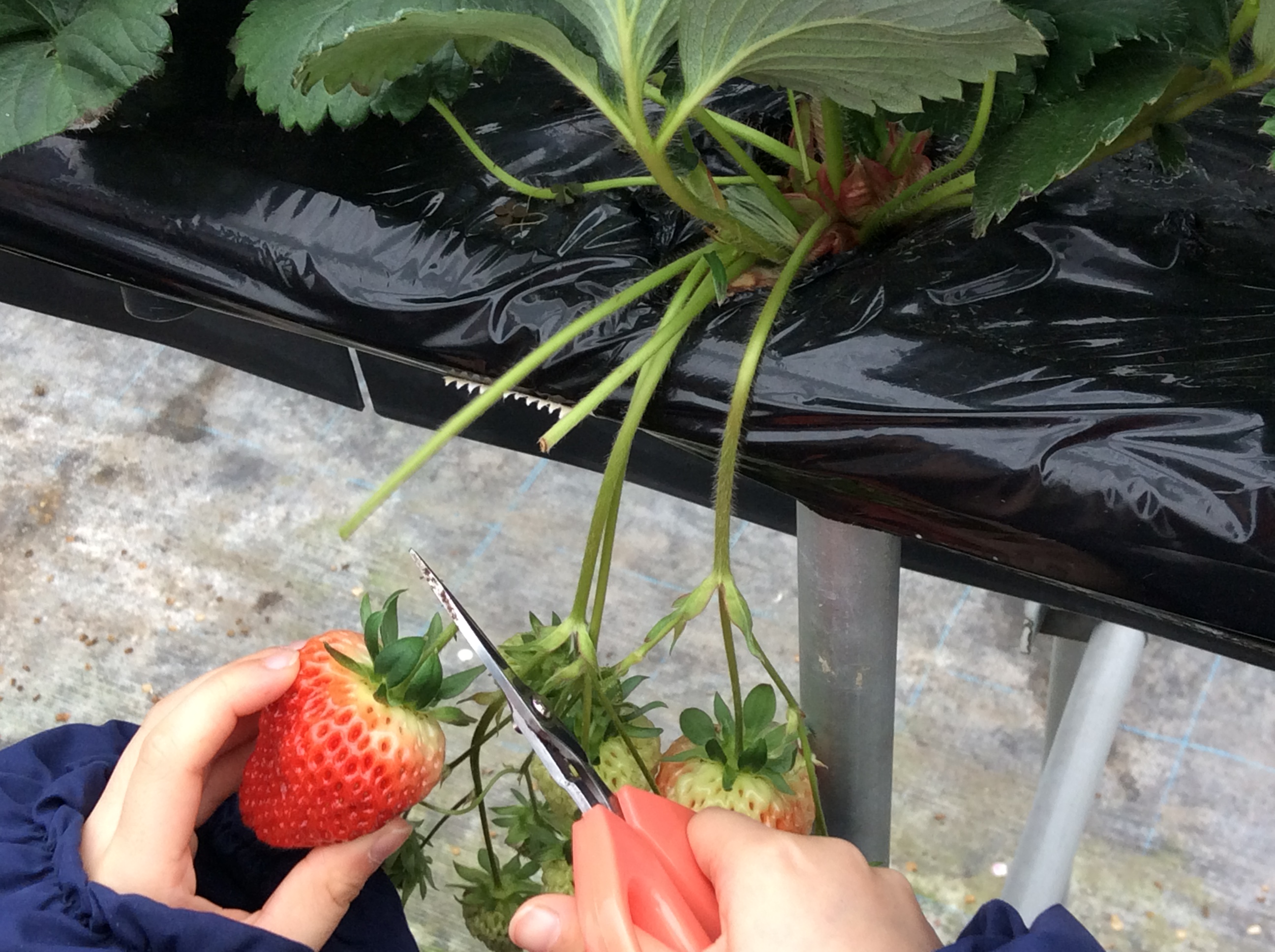 先日、イチゴ狩りにいきました。外はまだ寒いですが、ビニールハウスの中はとても暖かく、大きなイチゴがたくさんなっていました。
