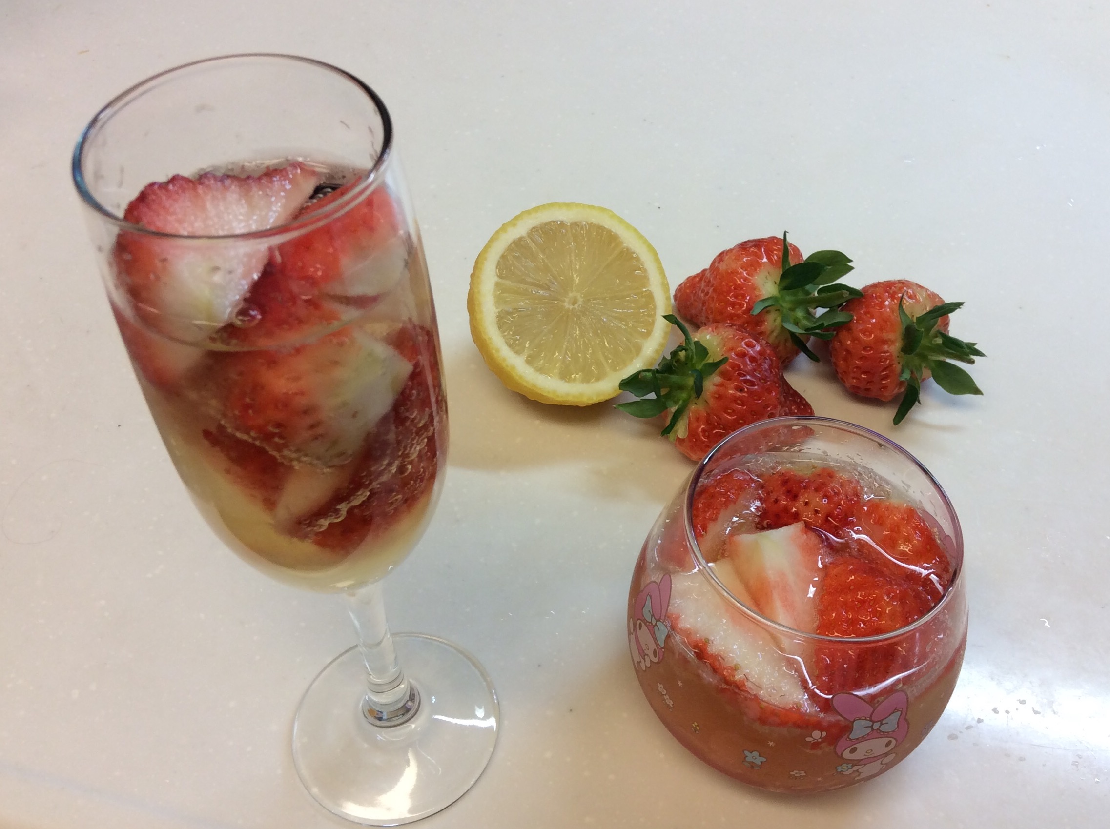 レモン汁とハチミツを加えたシャンパンにカットしたイチゴをたくさんいれたシャンパンカクテルです。多めのハチミツとシャンパンのかわりに炭酸水で割れば、イチゴがたっぷりはいった自家製レモンネードの出来上がりです!