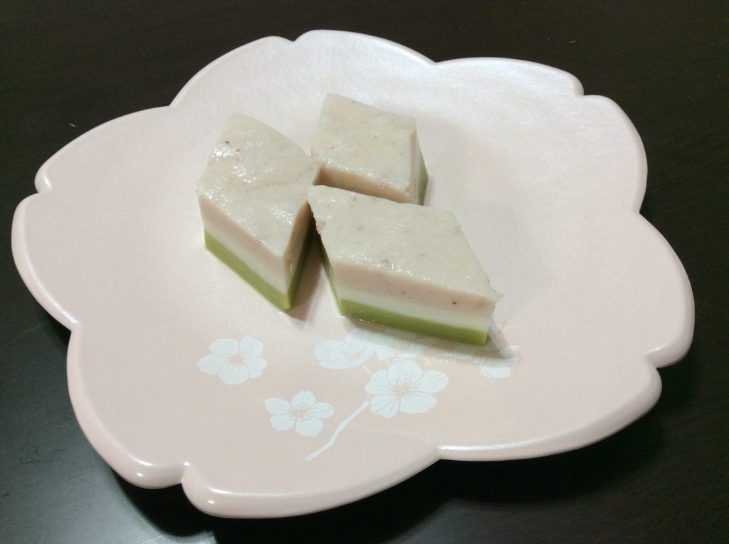 ひな祭りも近づいてきたため、ひな祭り寒天を作ってみました。白い牛乳寒天に加えて、ピンク色は市販の飲むイチゴヨーグルト、黄緑色は市販の抹茶ラテの寒天です。粉寒天を煮溶かし3つに分け、それぞれとまぜます。一段ずつゆっくり流していきますが、寒天は常温でも固まるのですぐにできました。ひし形に切って出来上がりです。