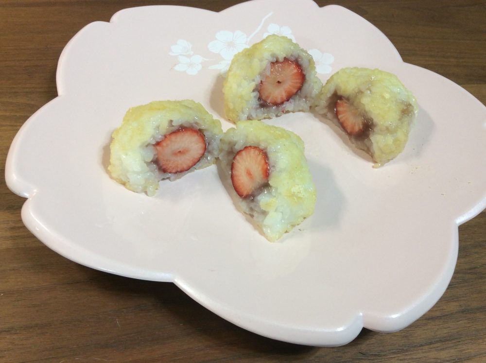 小さめのイチゴをこしあんでつつみ、おはぎの中にいれ、きな粉をまぶしました。