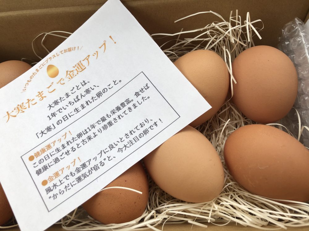 今年は暖冬で市内は全く雪もありませんが、今日は大寒です。 大寒から節分にかけては気温が最も寒く、寒さ対策を十分に行って外にでないと体調をくずしやすくなります。 私もビタミンDをしっかり摂取しているおかげかはわかりませんが、今年はまだ風邪やインフルエンザにはかかっていません。これから節分までの2週間、とくに寒さ対策をして乗りきろうと思います。 卵や金柑、小松菜もこの時期旬の食材で、たくさん食べるとよいそうです。 今年も大寒卵を買いにいってきました。